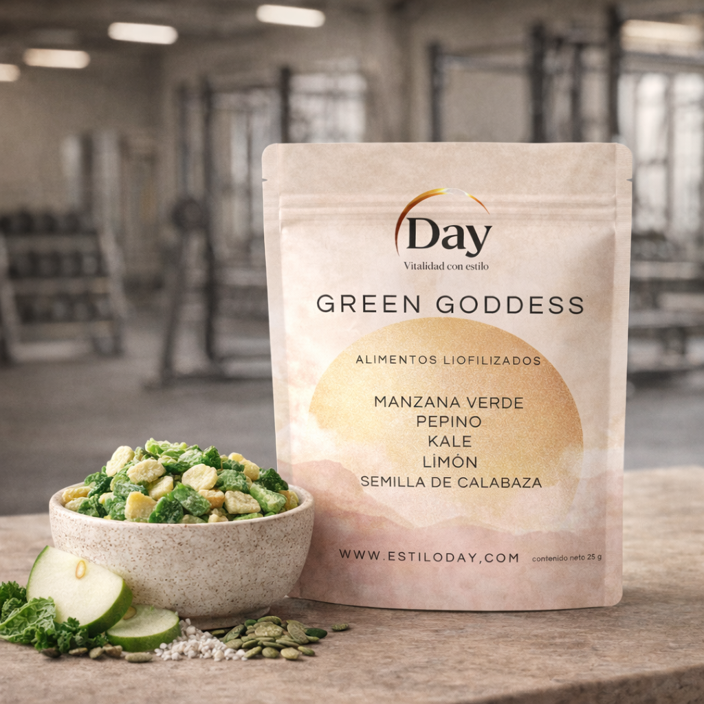 Green Goddess es un mix vegetal inspirado en lo fresco: manzana verde, pepino, hojas verdes y limón, con semilla de calabaza para crunch y saciedad. Perfil verde limpio (sin polvos amargos) y textura altamente crunchy.